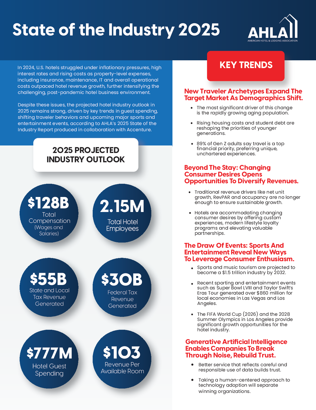 Despite these issues, the projected hotel industry outlook in 2025 remains strong, driven by key trends in guest spending, shifting traveler behaviors and upcoming major sports and entertainment events, according to AHLA’s 2025 State of the Industry Report produced in collaboration with Accenture.