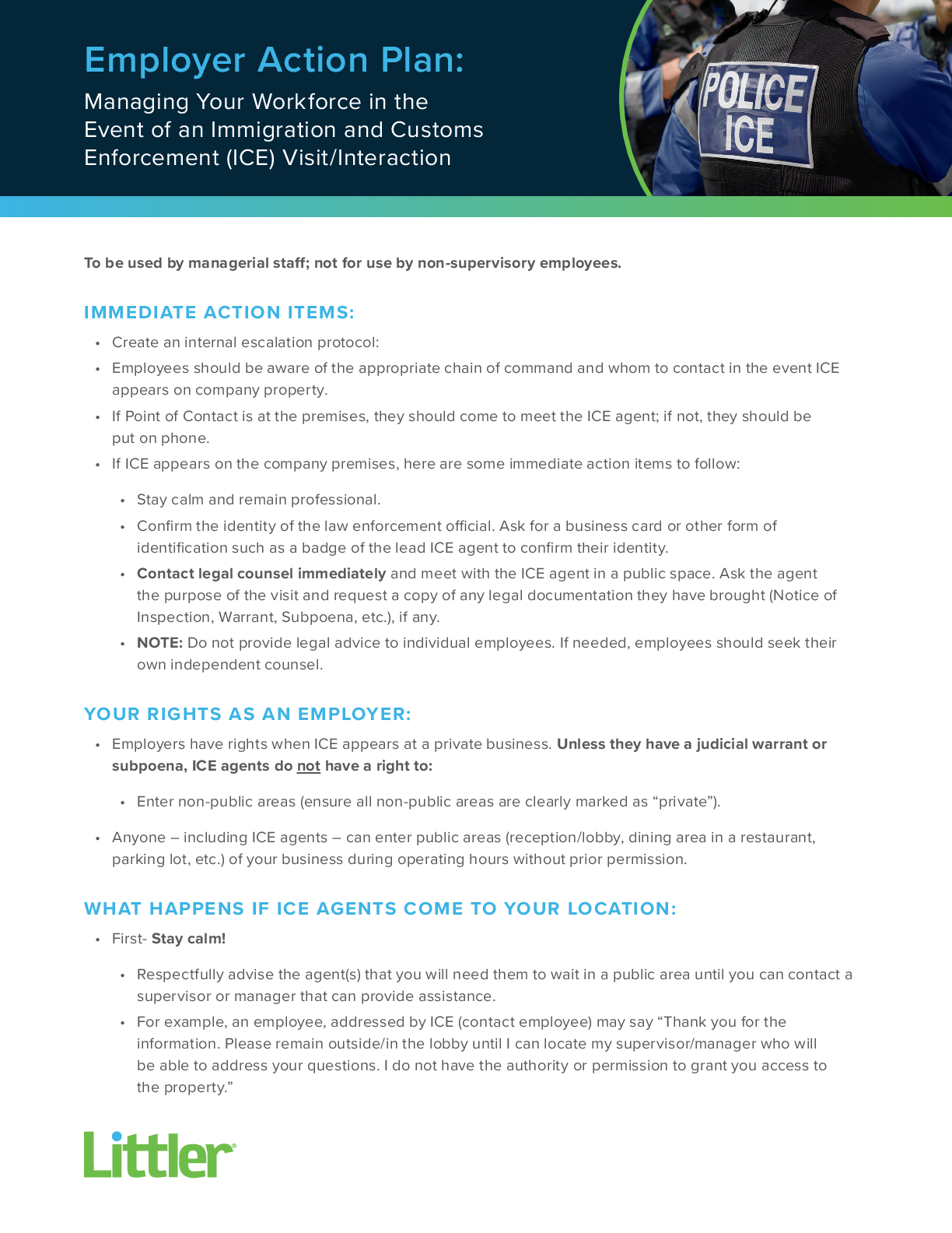 This Employer Action plan from Littler emphasizes the importance of having a strategic response plan for potential interactions with Immigration and Customs Enforcement (ICE) at hotel properties. This specific action plan is intended to be used by managerial staff; not for use by non-supervisory employees.