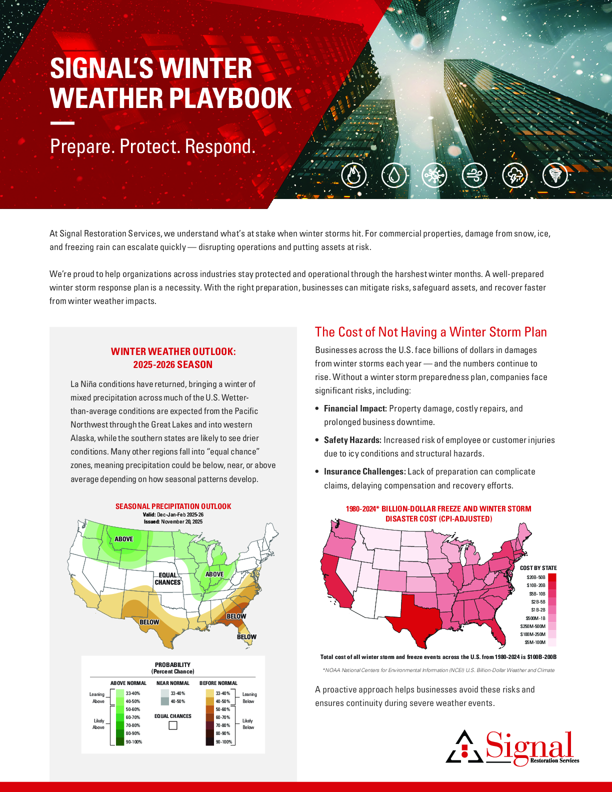 Signal Restorative Services proud to help organizations across industries stay protected and operational through the harshest winter months. A well-prepared winter storm response plan is a necessity. With the right preparation, businesses can mitigate risks, safeguard assets, and recover faster from winter weather impacts