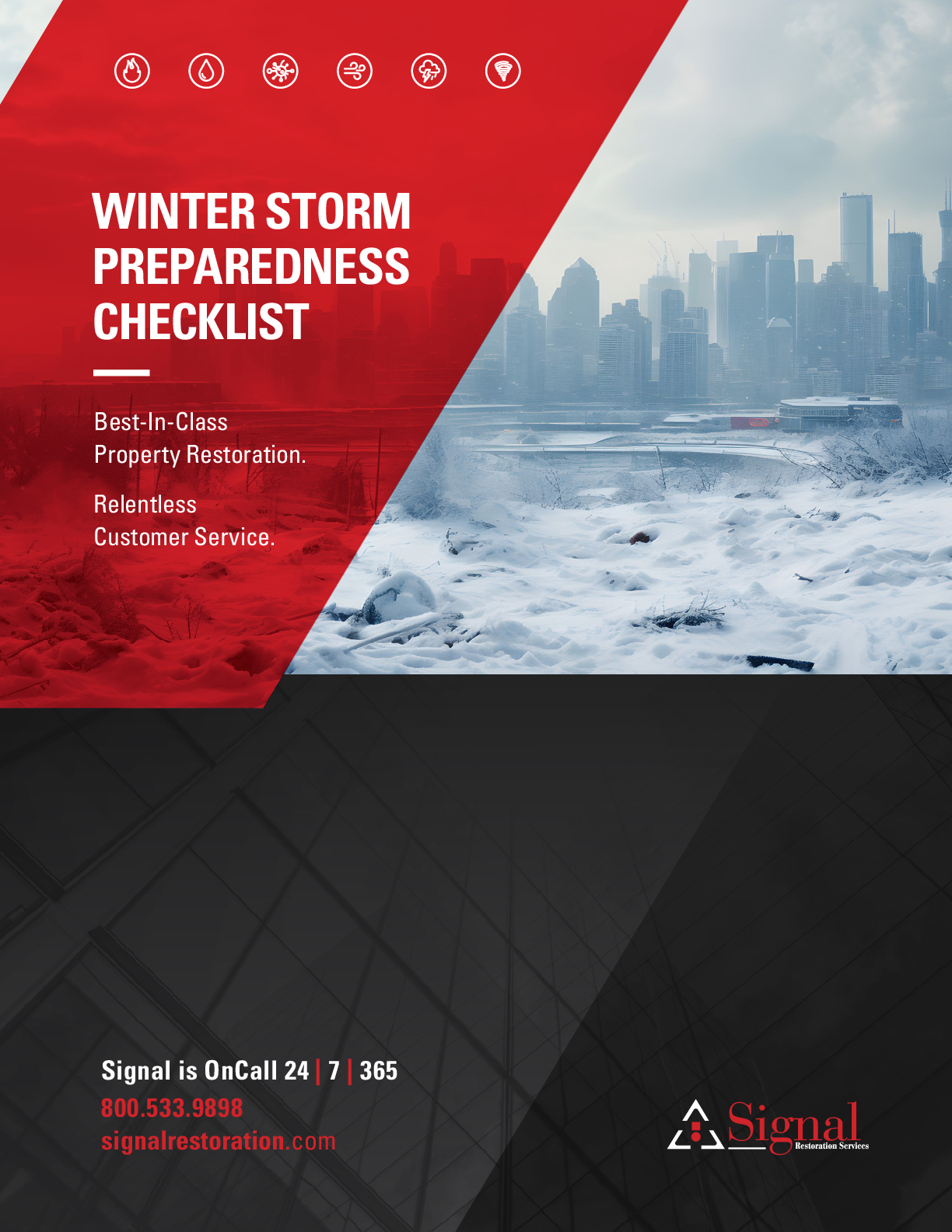 Signal Restoration Services Winter Storm Preparedness and Response Checklist designed to ensure safety and business continuity for hoteliers. Key recommendations include preparing buildings and equipment by stocking necessary supplies like rock salt and ensuring equipment is functional. Communication strategies emphasize establishing a clear chain-of-command, testing CRM communications, and updating contact information. During a storm, the focus is on maintaining safe access areas and monitoring temperatures, while post-storm efforts involve damage evaluation, prioritizing recovery, and ongoing communication to employees. This toolkit encourages partnering with disaster resilience experts, such as Signal, is highly recommended for comprehensive pre-planning and recovery support.